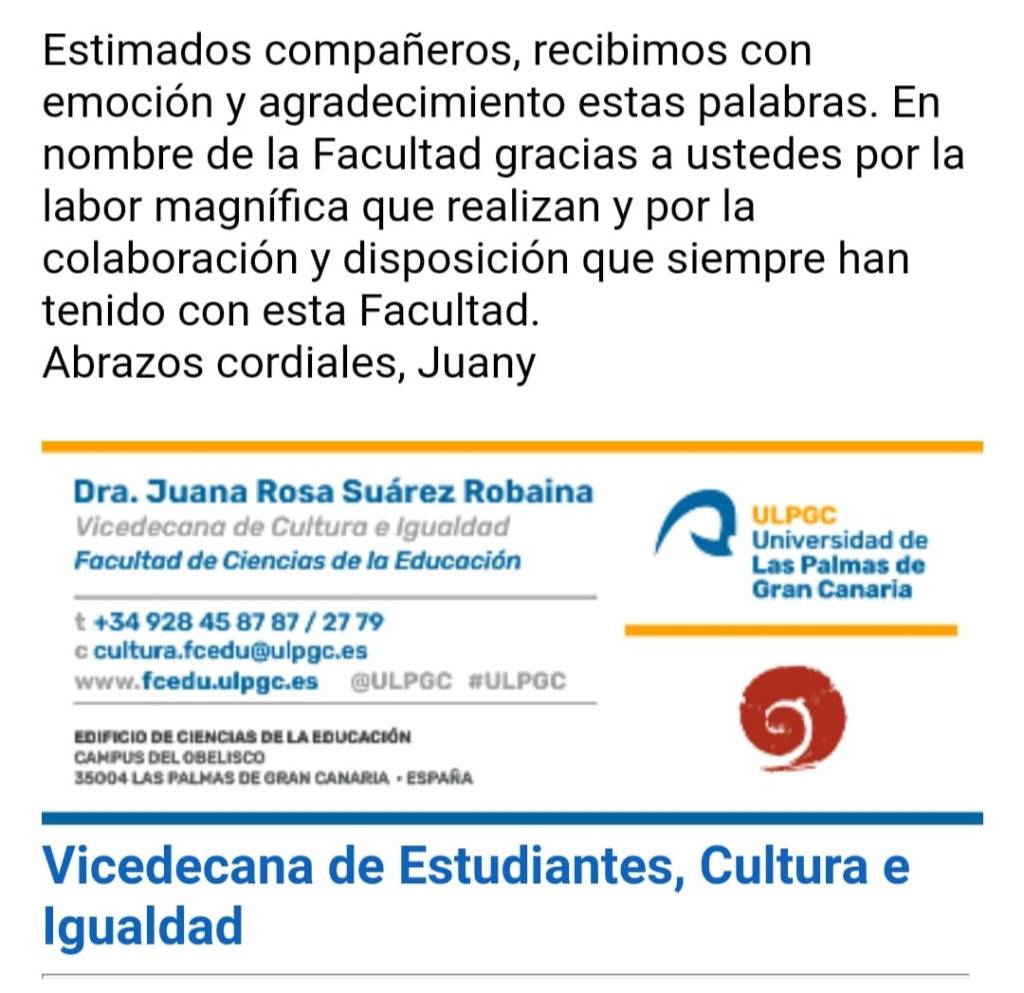 En las siguientes imágenes se puede apreciar el día de la recogida del calzado, en la Facultad de Ciencias de la Educación. En la foto se encuentra el presidente y la administrativa de la Asociación, una de nuestras alumnas en prácticas, un miembro de Cruz Roja y la Dra. Juana Rosa Suárez Robaina, vicedecana de Cultura e Igualdad, quien nos agradece en el correo de la segunda imagen nuestra labor con la Facultad.